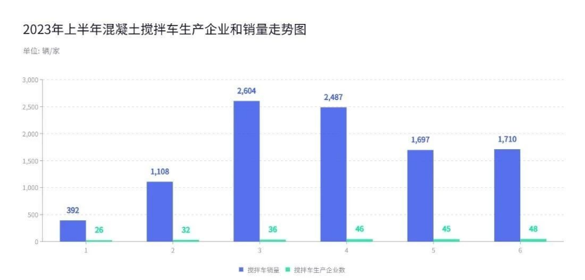 從生產(chǎn)企業(yè)來看,2023年1-6月三一、中聯(lián)重科、徐工施維英位居銷量前三甲,銷量分別為2820輛、1926輛、1000輛,前三甲企業(yè)銷量占總銷量的57%。