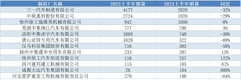 但位列前三甲的三一和中聯(lián)重科的銷量呈明顯下滑趨勢(shì),徐工施維英的銷量與2022年上半年相比小幅上漲。其中,成都大運(yùn)和徐工汽車的銷量漲勢(shì)喜人,同別分別增長(zhǎng)122%和608%。
