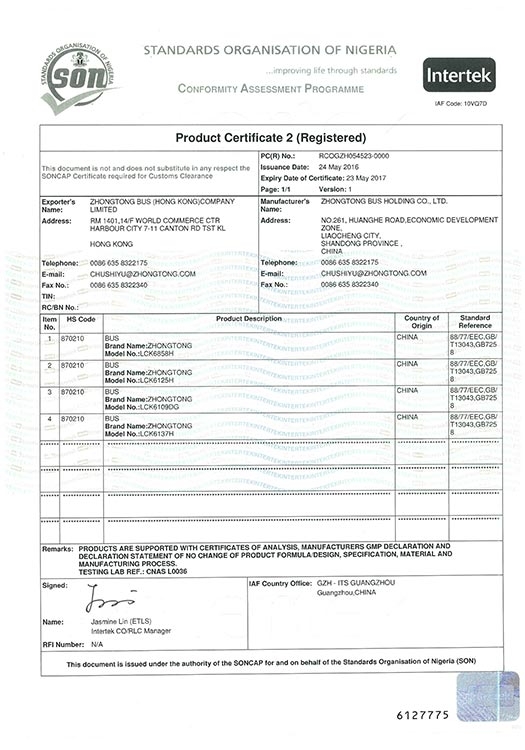 • Сертификат SONCAP для автобусов LCK6858H, LCK6125H, LCK6109DG, LCK6137H