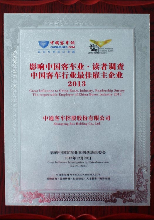 • Награда "Почётный работодатель автобусостроительной промышленности Китая", 2013 год