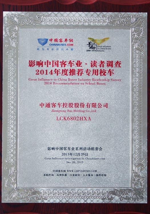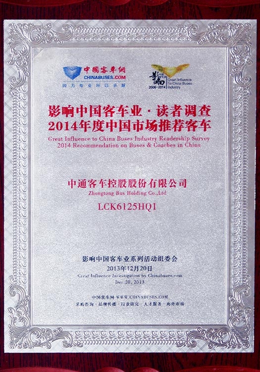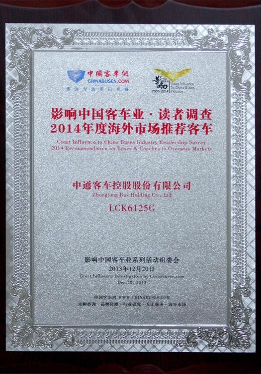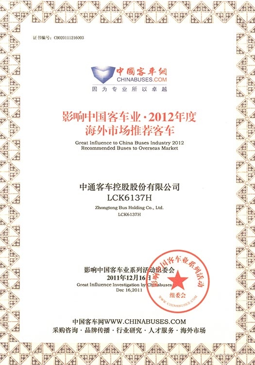 • Награда "Рекомендуемый автобус китайского производства для международного рынка" (модель LCK6137H), 2012 год