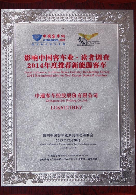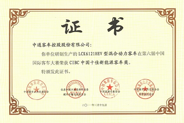 • Награда "Топ-10 китайских автобусов на электрической тяге (модель LCK6121HEV)"