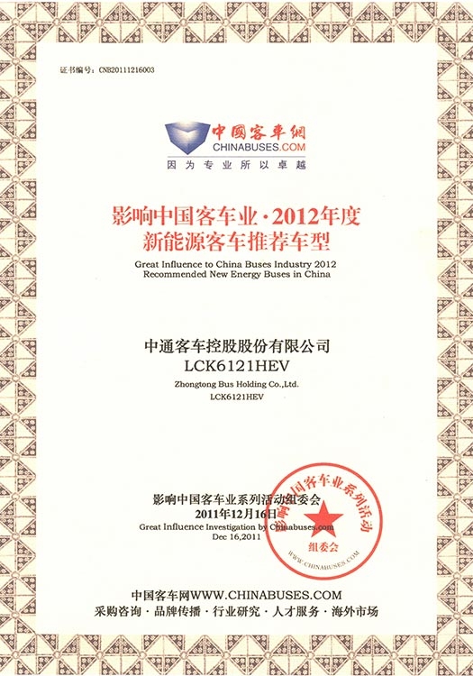 • Награда "Рекомендуемый автобус на электрической тяге для китайского рынка" (модель LCK6121HEV), 2012 год