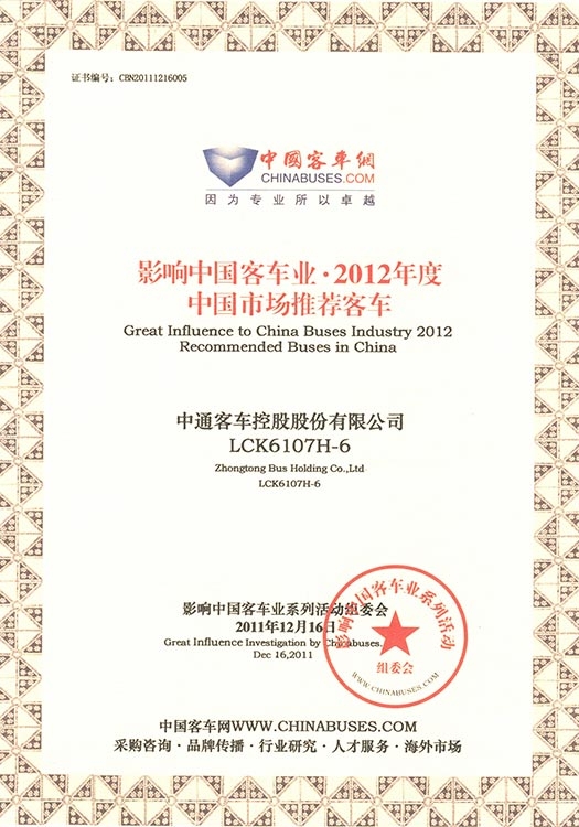 • Награда "Рекомендуемый автобус для китайского рынка" (модель LCK6107H-6), 2012 год