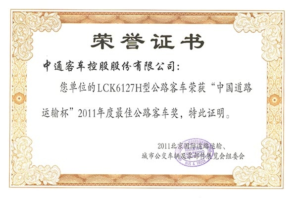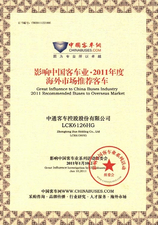 • Награда "Рекомендуемый автобус китайского производства для международного рынка" (модель LCK6126HG), 2011 год