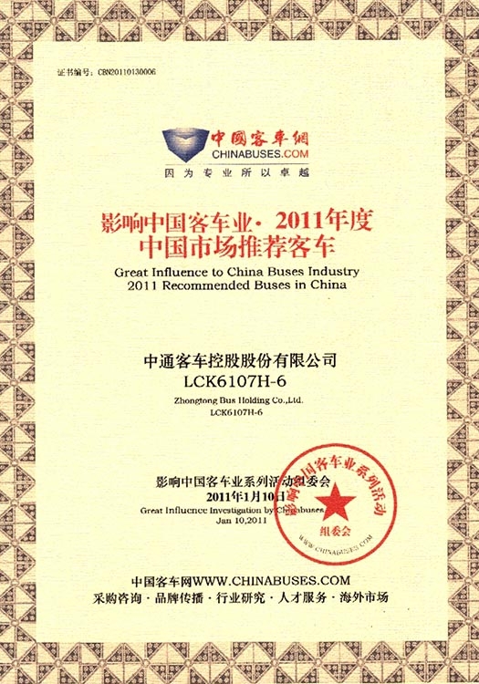 • Награда "Рекомендуемый автобус для китайского рынка" (модель LCK6107H-6), 2011 год
