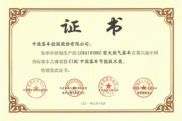 • Награда CIBC за энергоэффективность автобусов модели LCK6105HGC