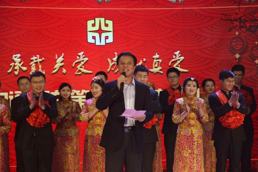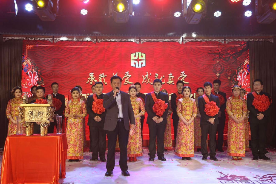 “新中式”禮儀,去傳統(tǒng)之糟粕,皆現(xiàn)代文明精華,引入企業(yè)文化理念?;槎Y儀式在現(xiàn)代震撼的燈光秀和傳統(tǒng)熱鬧的舞獅表演拉開序幕,11對新人陸續(xù)登臺,敬天祈福,感恩答謝,公司總經(jīng)理孫慶民先生為新人證婚、董事長李樹朋先生為新人主婚、嘉賓山東省交通廳高洪濤廳長也給新人帶來美好的新婚祝福。