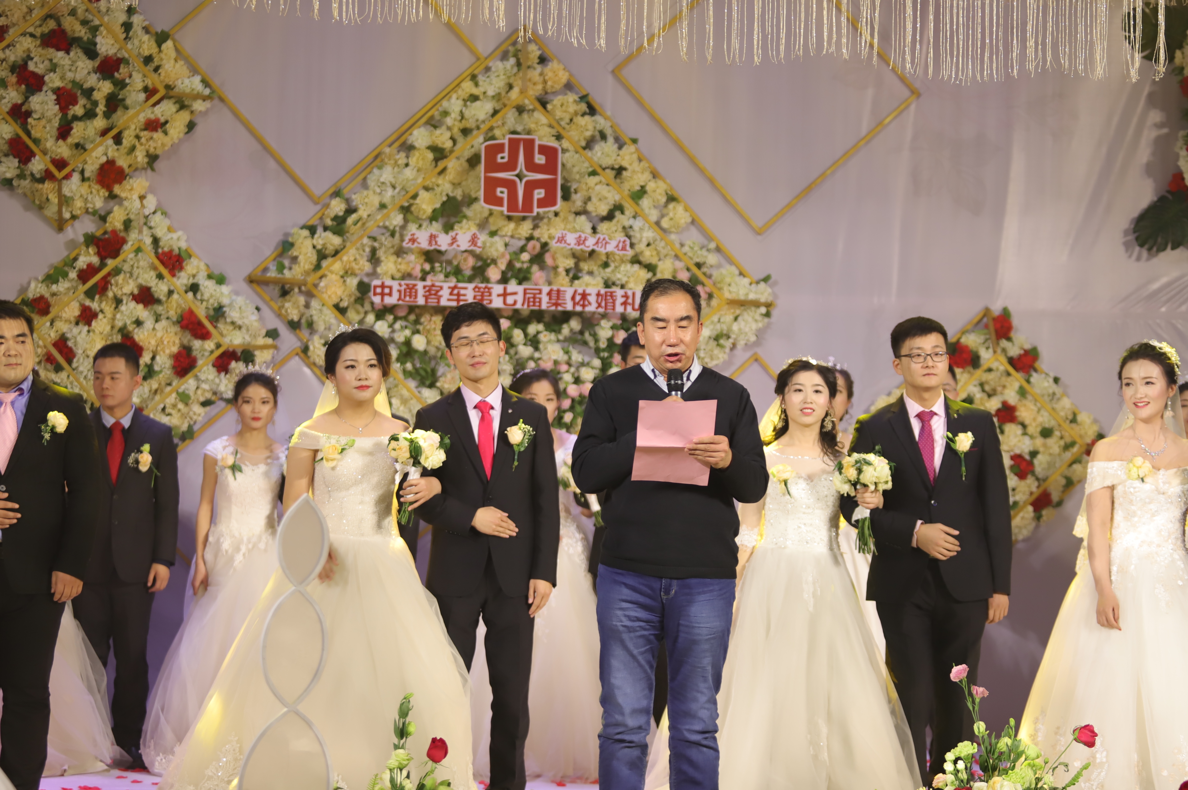 李樹朋董事長因在山東重工集團開會,未能參加當晚的儀式,但是董事長一直在牽掛著集體婚禮的舉辦并專程從濰坊發(fā)來賀信,向十二對新人和新人父母祝賀。儀式中,公司黨委副書記、工會主席、中通客車紅娘協(xié)會會長于春印為12對新人證婚,表達了公司對新人的祝福;公司黨委書記、總經(jīng)理孫慶民為新人主婚,以家長的姿態(tài)表達了對新人未來工作生活的殷切的希望。相信,在公司領(lǐng)導的重視下,在公司文化氛圍的熏陶下,這些新人必將成長為公司未來發(fā)展的骨干和棟梁。